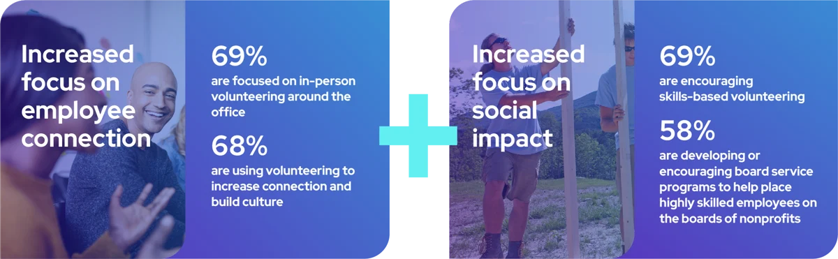 More than half of companies (55%) are now evolving their programs further, focusing not just on creating employee connections as they did the past few years through return to office programs. They are now also focusing on driving social impact more deeply through skills-based volunteering and nonprofit board service programs.